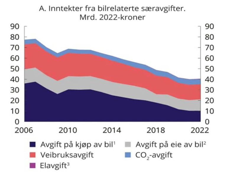 Statens inntekter fra engangsavgiften har falt betydelig i takt med elektrifiseringen av bilparken, siden nullutslippsbiler er fritatt for engangsavgift, i tillegg til mva-fritaket. I 2010 ga bilavgiftene staten nesten dobbelt så høye inntekter som i dag, om lag 70 milliarder kroner.