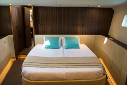 Det først som slår en er hvor mye plass det er over alt. Det store soltaket som sørger for at sittegruppene på dekk får skygge, vitner om at denne båten er bestilt av noen som gjerne seiler i områdene rundt Middelhavet. YYachts tilbyr tilpasninger og skreddersydde løsninger på det aller meste, og kan konfigurere båten i henhold til hva slags bruk eieren ser for seg.