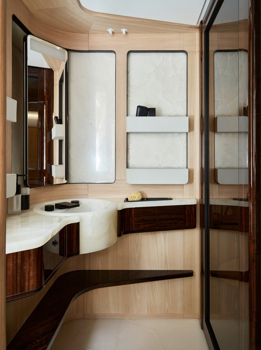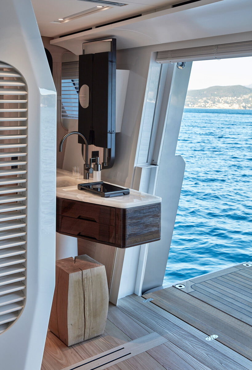 Studio Liaigre valgte ganske spesielle løsninger med masse geometri i innredningen. Det er med på å gi yachten et håndverksmessig, forseggjort preg. Du vil nok kanskje tenke at enkelte detaljer er litt overkill.