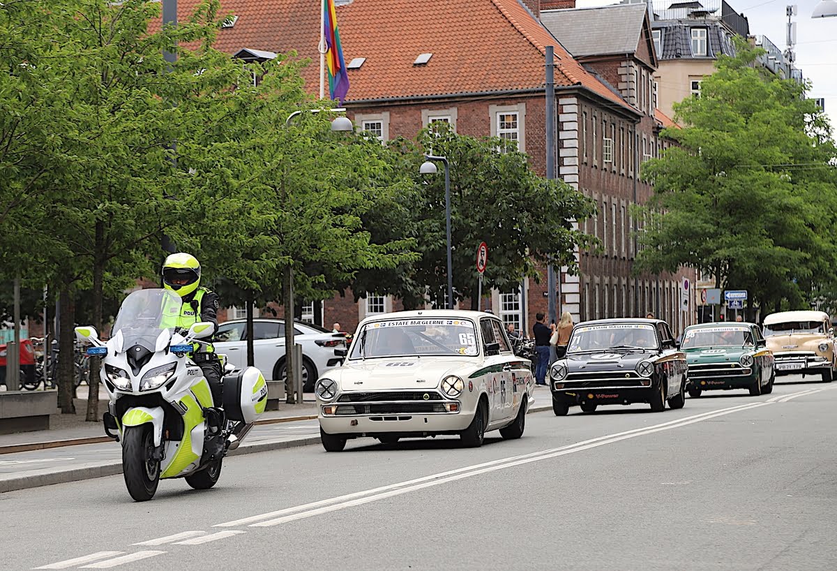 MOTTAGELSE I SENTRUM: Fredag ettermiddag kjører en rekke av deltagerne i kortesje inn til København for utstilling på Rådhusplassen. Her ledet an av Prins Joakim i Lotus Cortina.
