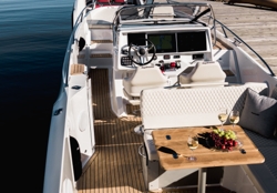 Windy SLR/SR60 har rikelig med sitteplasser på dekk, både under tak og i mer solrike områder. En sittegruppe med sofa og spisebord midtskips ser ut som et fristende sted å servere fersk fangst og en kjølig forfriskning.