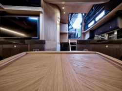 Detalj-arbeidet på paneler, sømmer og sammenføyninger er vakkert utført, og store gode vinduer gir mengder av sollys på hoveddekket. Eierens kabin benytter hele båtens bredde som er 16 fot, eller fem meter for de som ikke har maritime måleenheter i ryggraden. Bakerst er det en garasje på 3,3 meter lengde, med plass til lettbåt og diverse utstyr.