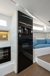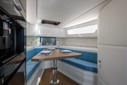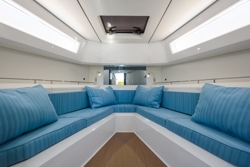 Evo R4XT er helt tydelig tiltenkt late dager på sjøen med mye sol og bading, men det er også overraskende mye plass under dekk. I forpiggen har de plassert en stor sofagruppe med spisebord, som enkelt skal kunne gjøres om til soveplass.