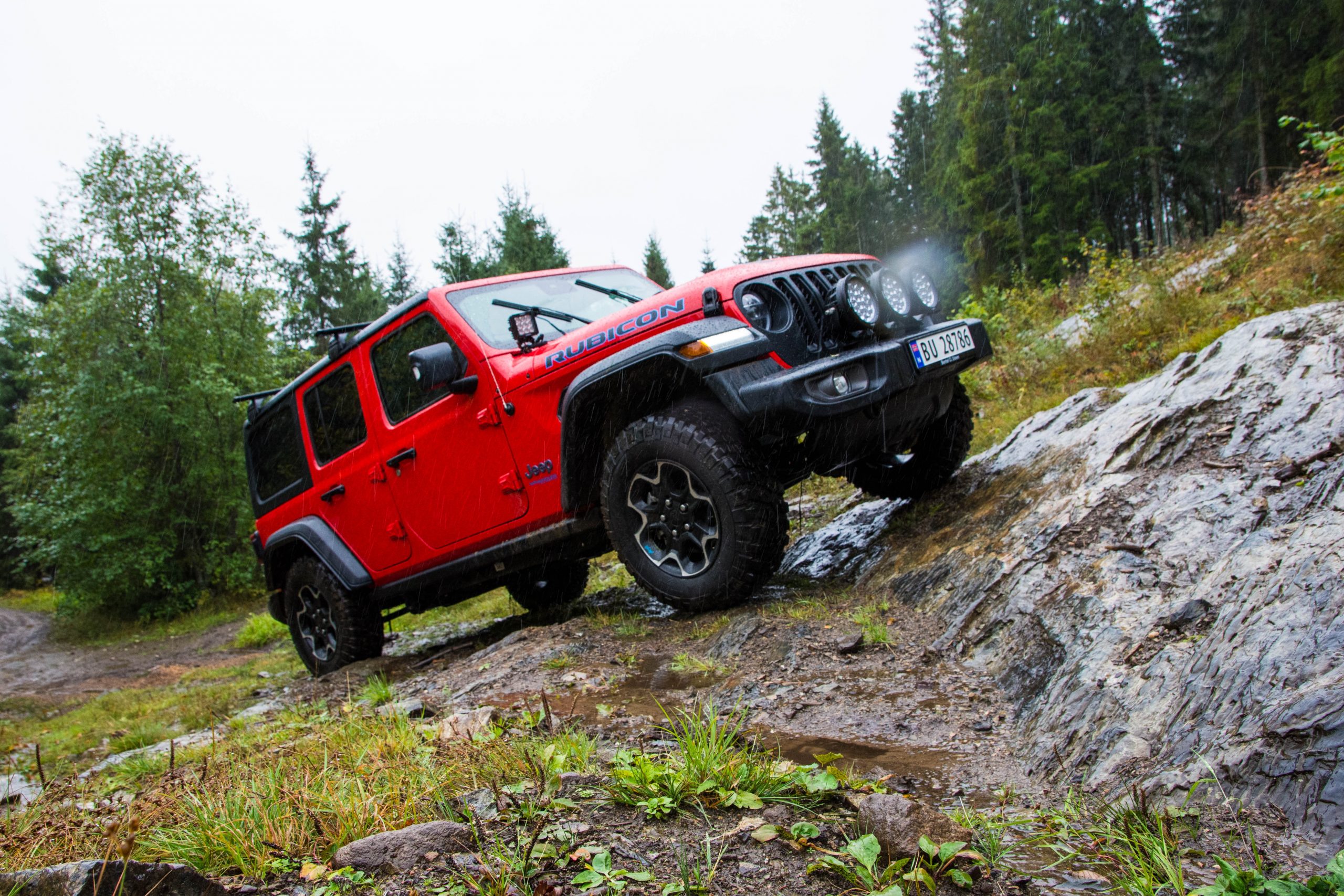 KRABBE: Jeep Wrangler 4Xe Sahara er utstyrt med krabbe-modus som hjelper deg ned bratte bakker dekket av sleip gjørme, og opp igjen på andre siden.