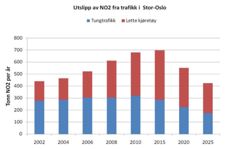 Forventet utvikling i utslipp av NO2 fra trafikk i Stor-Oslo