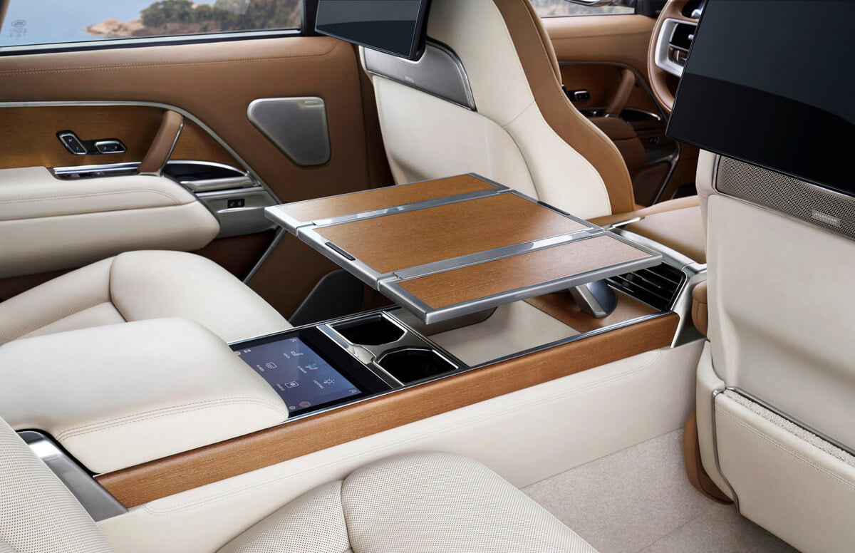 Men det er nok fort glemt når du først kommer deg på innsiden. Der venter digre lenestoler som i SV-utgaven kan justeres i 24 forskjellige retninger og by på mengder av massasjeprogrammer. Den som ikke finner seg til rette der sitter sannsynligvis feil vei. Baksetene har selvsagt eget kontrollpanel for å innta middagslur, arbeidsbord kalt «club-table» og et lite kjøleskap med rom for fire kalde forfriskninger. Mye av dette krever nok en fryktløs tilnærming til sluttfakturaen, men lekkert er det. En fordel med de store flatene langs siden av bilen er at versjonen med lang akselavstand også ser ganske bra ut. Der venter nok en nyvinning for Range Rover, nemlig en tredje seterad. Diverse elektromotorer skal flytte baksetene fremover for å lette adkomsten til bakerste rad, når samtlige syv seter tas i bruk. Vel på plass loves det godt med benplass for hele selskapet. Luften skal være av det friske slaget, og Range Rover er ikke snauere enn å slå fast at det nye filtreringssystemet også fanger opp og fjerner forekomster av koronaviruset.