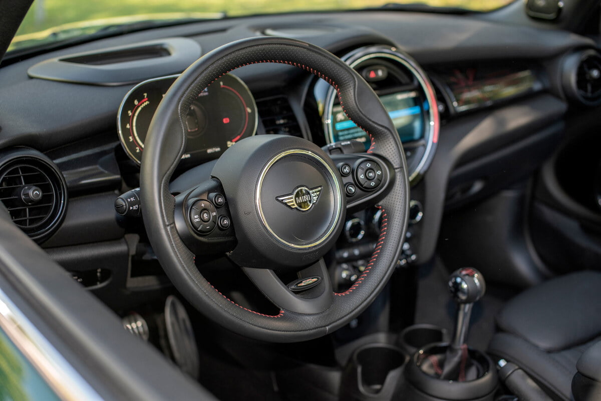 Mini JCW Convertible er kanskje den Mini-en med artigst utseende. Taket med innsydd mønster trekker opp.