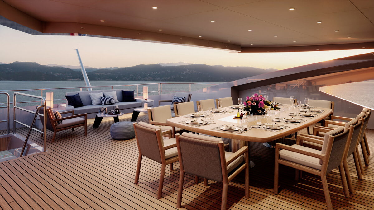 På babord side, mellom eierlugaren og trappen, har kokken sin arbeidsplass. Det er veldig god plass i byssa og plassen har en praktisk oppdeling. I tilknytning til byssa er det et pantry som kan brukes som avlastning når mannskapet skal servere gjestene mat i salongen. Byssa er forbundet med et langt mer beskjedent pantry på brodekket med en matheis. Harrison Eidsgaard foreslå at man bruker plassen på dekk i akterkant av salongen på brodekket som spiseplass i friluft. Fra dette dekket går det trapp opp til et soldekk med blant annet boblebad og bar. Hvis du vil, kan du også ha langbord her, med plass til 12 personer.