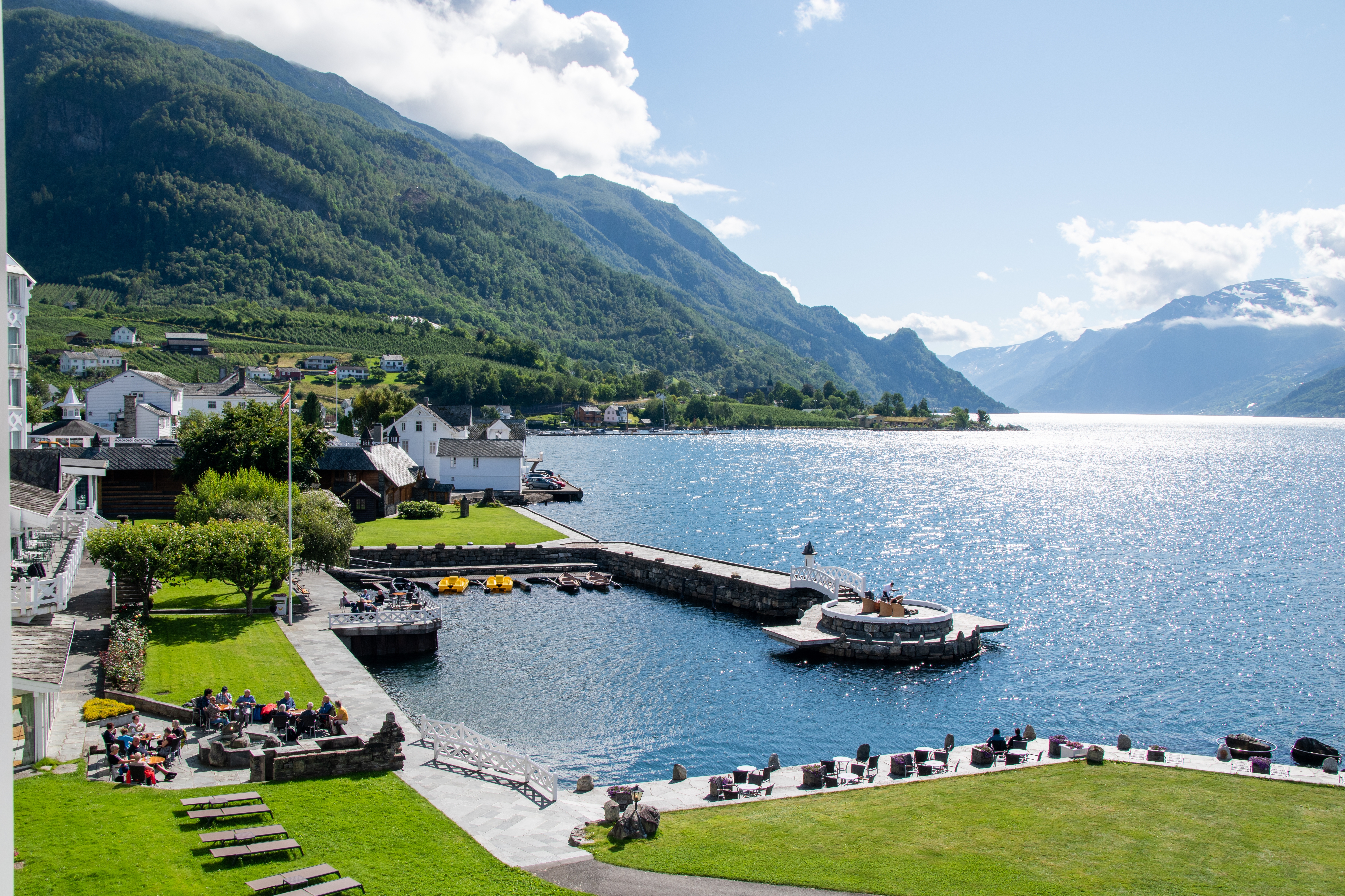 VESTLAND, VESTLAND….: Utsikten fra Hotel Ullensvang ut over Hardangerfjorden gjør at du gjerne lar elbilen stå lenge til lading.