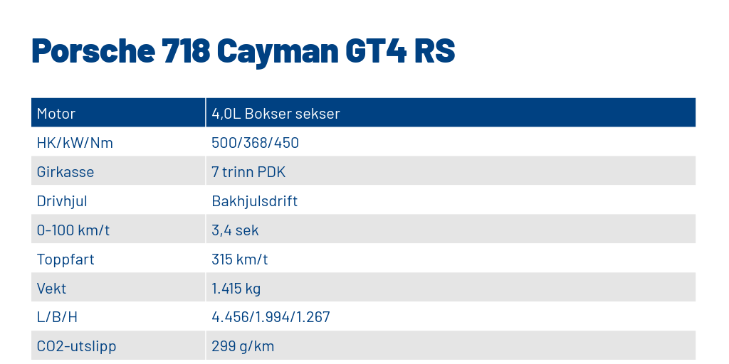 Porsche 718 Cayman GT4RS er altså svaret på det mange Porsche-fans har lurt på, nemlig hva resultatet ville bli dersom en tok motoren fra 911 GT3 og plasserte den i en Cayman. De fleste lesere er nok godt kjent med de to modellene, men kraftig forenklet ligger en av de viktigste forskjellene i at 911 har hekkmotor, og Cayman har motoren midtskips.