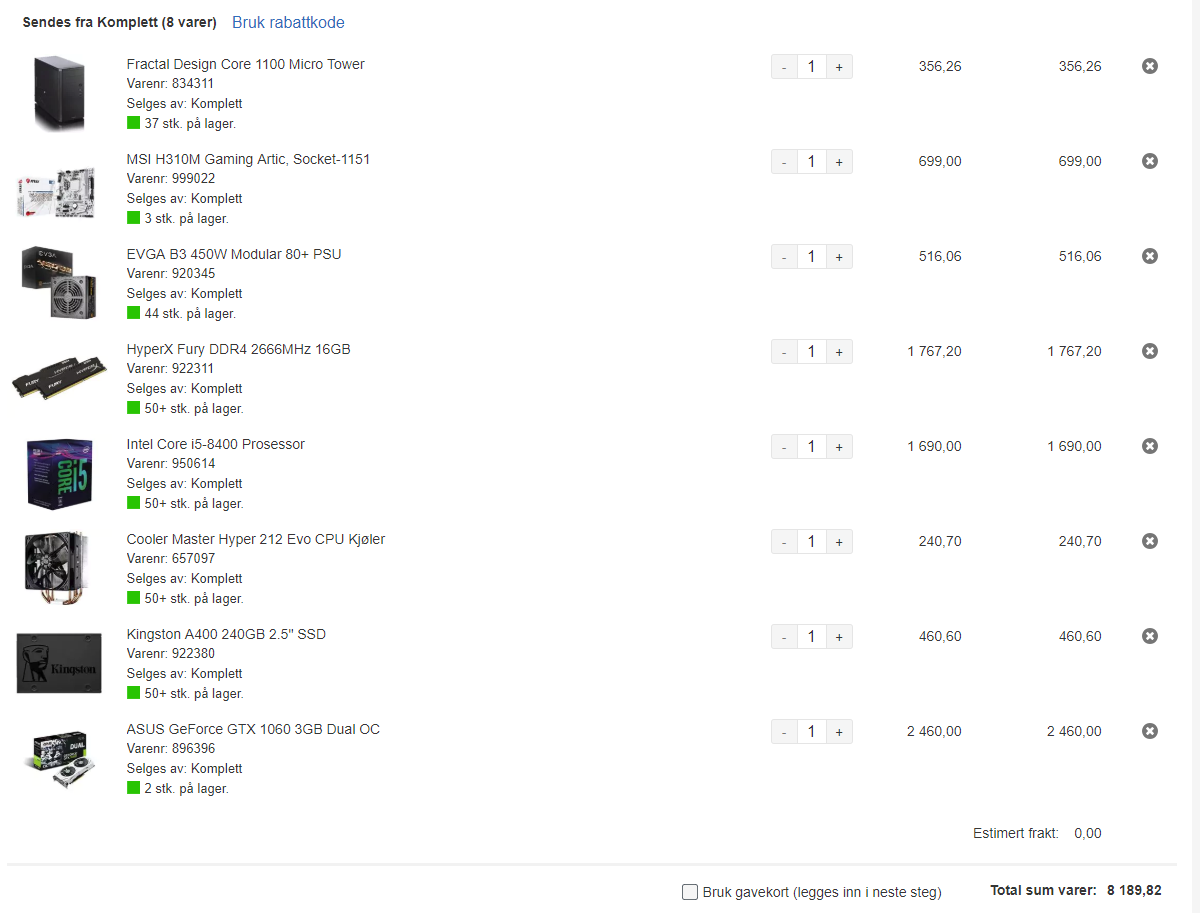 Jeg legger ved en skjermdump av komponentene som jeg har satt sammen. Jeg vurderer å ta bort skjermkortet og kjøpe et billigere brukt på finn. Synes det var litt dyrt med skjermkort.