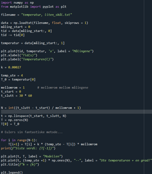 Hei, jeg sliter med en oppgave jeg har fÃ¥tt i programmering og modellering x som er et nett basert fag. Oppgaven jeg har valgt er følgende;  «NÃ¥r strømmen blir slÃ¥tt av i varmebassenget i Oasen, hvor lang tid tar det før vannet er kjølt ned?», der jeg skal bruke diff.likningen i et python program … Les mer